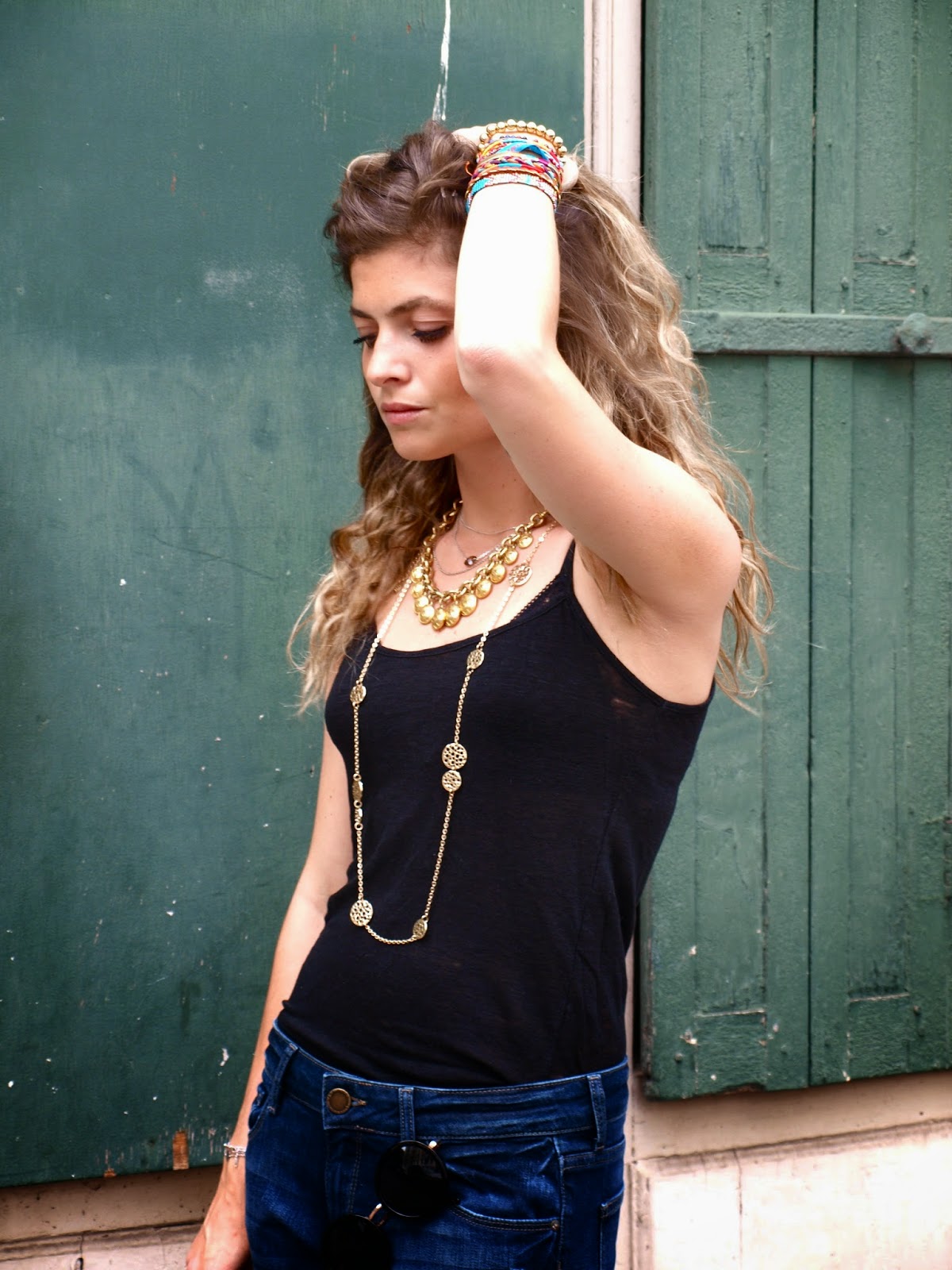 J’ai opté pour le coté simple et chic. Je vous propose ma tenue avec mon jeans boyfriend de la marque DL1961 à la couleur indigo qui est très agréable et tellement confortable, que j’ai combiné avec un top tout simple et mes nouvelles sandales à talons. J’avais envie de chaussures confortable à l’esprit sabot. Je les ai trouvé sur un site qui propose des chaussures pas cher. Pour accessoiriser ma tenue, je porte des bijoux dorés pour le côté chic.