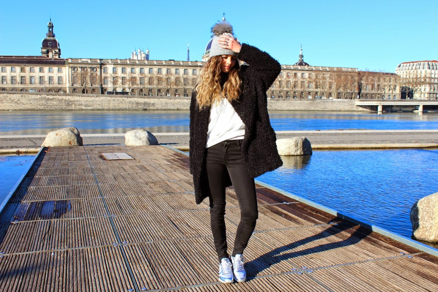 Manteau : Mango – Jeans* : Pimkie – Pull*: Kiabi – Baskets : Nike – Bonnet: Point Neige – Bague tête de mort* : Jolie Demoiselle – Bague cercle strass* : Jolie Demoiselle – Bracelet* : Jolie Demoiselle