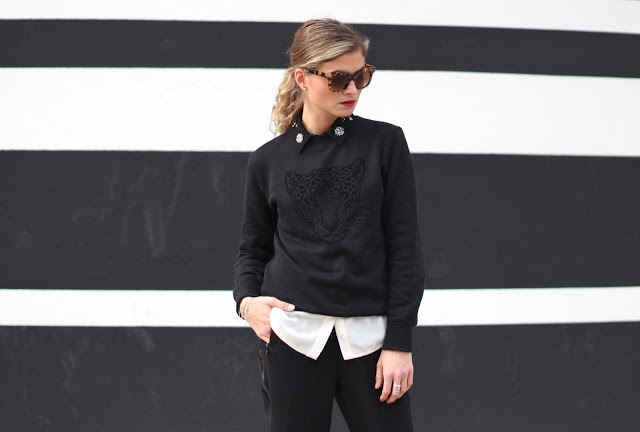 Aah c'est vrai que c'est très sympa cet effet d'optique sur ces photos, comme si tu faisais partie du mur, j'aime beaucoup ! 😉 Ta tenue est canon, ton chemisier était fait pour aller avec ce sweat ! Au top !!