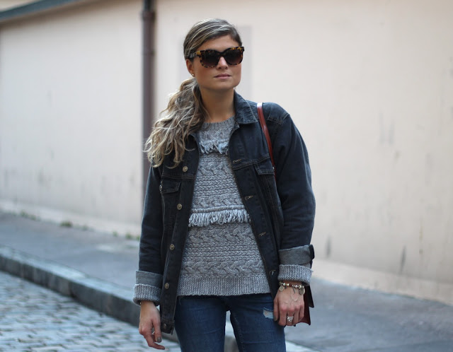 Celui que je porte aujourd’hui vient de la marque Deby Debo. Une marque à l’esprit bohème. J’ai eu l’occasion de découvrir la collection printemps-été 2016 et elle va être canon ! Il est en mailles ajusté de franges. Non mais j’adore ! Pour aller au plus simple, je porte un jeans avec des boots de chez New Look pour donner une touche de féminité à la tenue. Pour les accessoires, je porte mes lunettes Jimmy Fairly ( ancienne co modèle Angura) et mes nouvelles bagues de chez L’Atelier d’Amaya. Une tenue casual avec des basics et encore, un nouveau pulls gris.