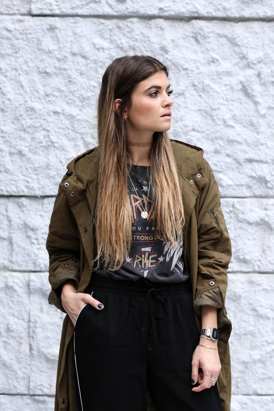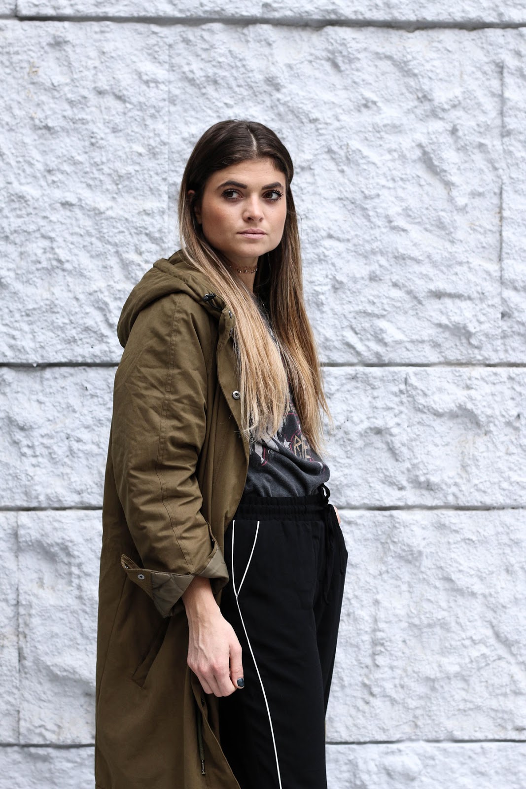 Parka* : American Vintage (taille M, oversize comme j’aime) – Tee-shirt : Pull and Bear (taille S, parfait) – Pant : Pull and Bear (38 mais un peu grand) – Escarpins : NewLook – Ras de cou : Pull and Bear