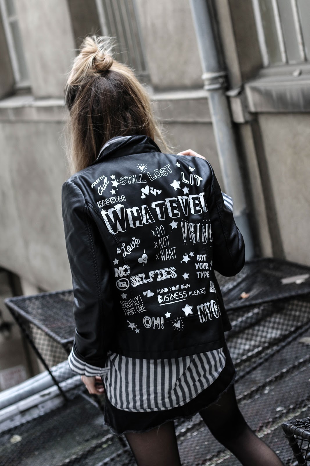 Ce perfecto vient de chez Primark et il est issue de la nouvelle collection. Je pense que vous devriez le trouver assez facilement. Au delà du simple perfecto que l’on peut avoir dans le dressing, les inscriptions dans le dos sont les détails subtils qui donnent un réel style à cette veste. Pour cette inter saison, les marques proposent pas mal de perfecto avec des détails comme des broderies, des clous ou encore des écritures. Niveau taille, je porte un 40 donc essayer bien le perfecto avant de l’acheter.