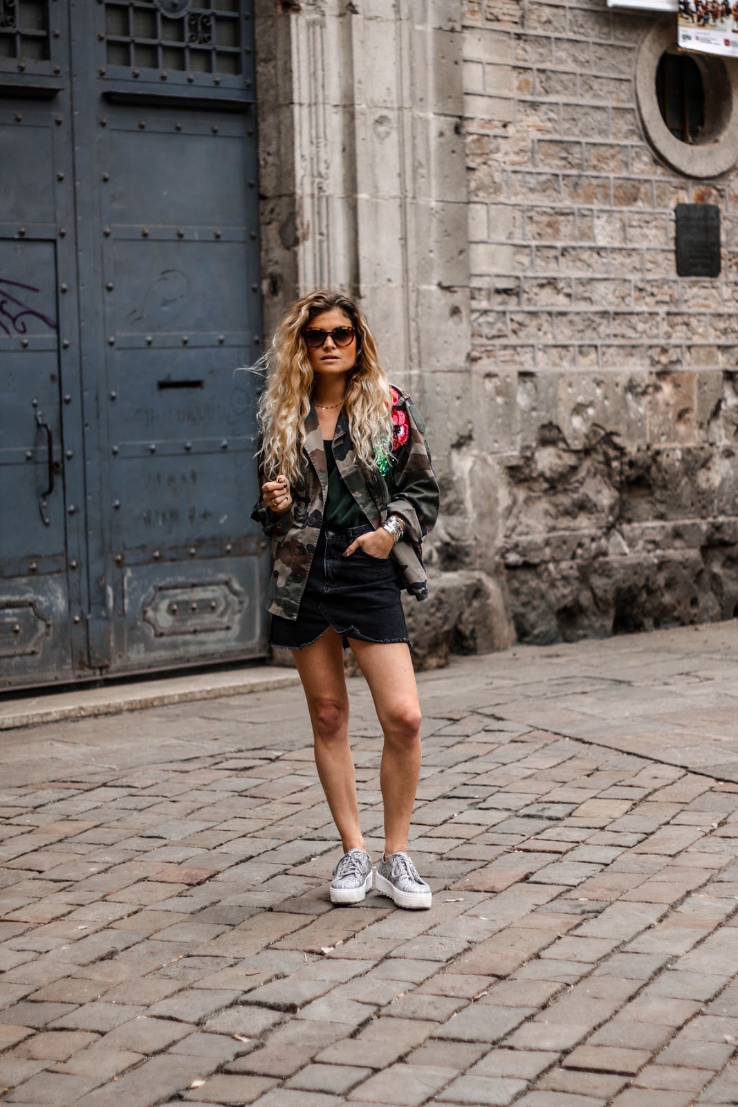 Il y a quelques temps, la créatrice Poupée de soie Paris m’a contacté pour me présenter les vestes costumisées qu’elle réalisait. Et alors là, BIG coup de coeur ! J’ai tout de suite flashé sur cette veste camo avec une ambiance tropical via des patchs de paillettes cousus. Fleurs tropicales, perroquet et ananas, ouloulou j’adore ! Elle m’a proposé de faire inscrire au dos un mot ou même mon prénom mais j’ai préféré gardé uniquement les patchs tropicaux. Donc vous pouvez personnaliser à fond votre veste les filles. Sur le devant de la veste, elle a cousu mon initiale M. Il faut aimé ce style de pièce clairement voyante ! Avec ce type de vêtement ultra fort, je vous conseille d’opter pour look simple.