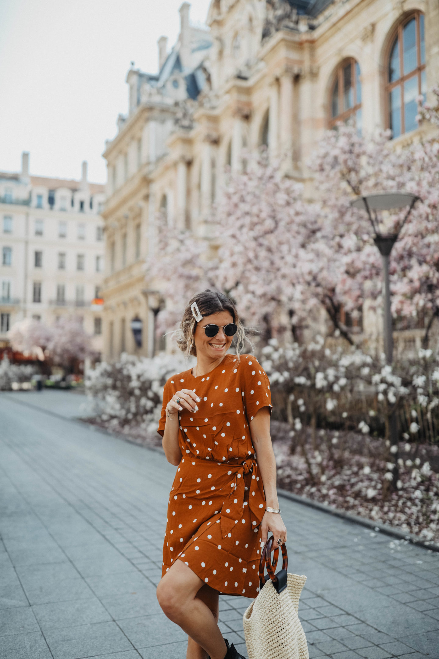 Ce look date de quelques semaines, c’est vrai mais il reste quand même dans le thème du printemps. J’ai tout de suite aimé la coupe de la robe avec des manches et l’attache à l’aide d’un noeud sur le côté. La couleur est terracotta avec des pois blanc. Elle se porte hyper facilement. Pour la taille, j’ai pris un 36 donc n’hésitez à pas prendre votre taille habituelle.