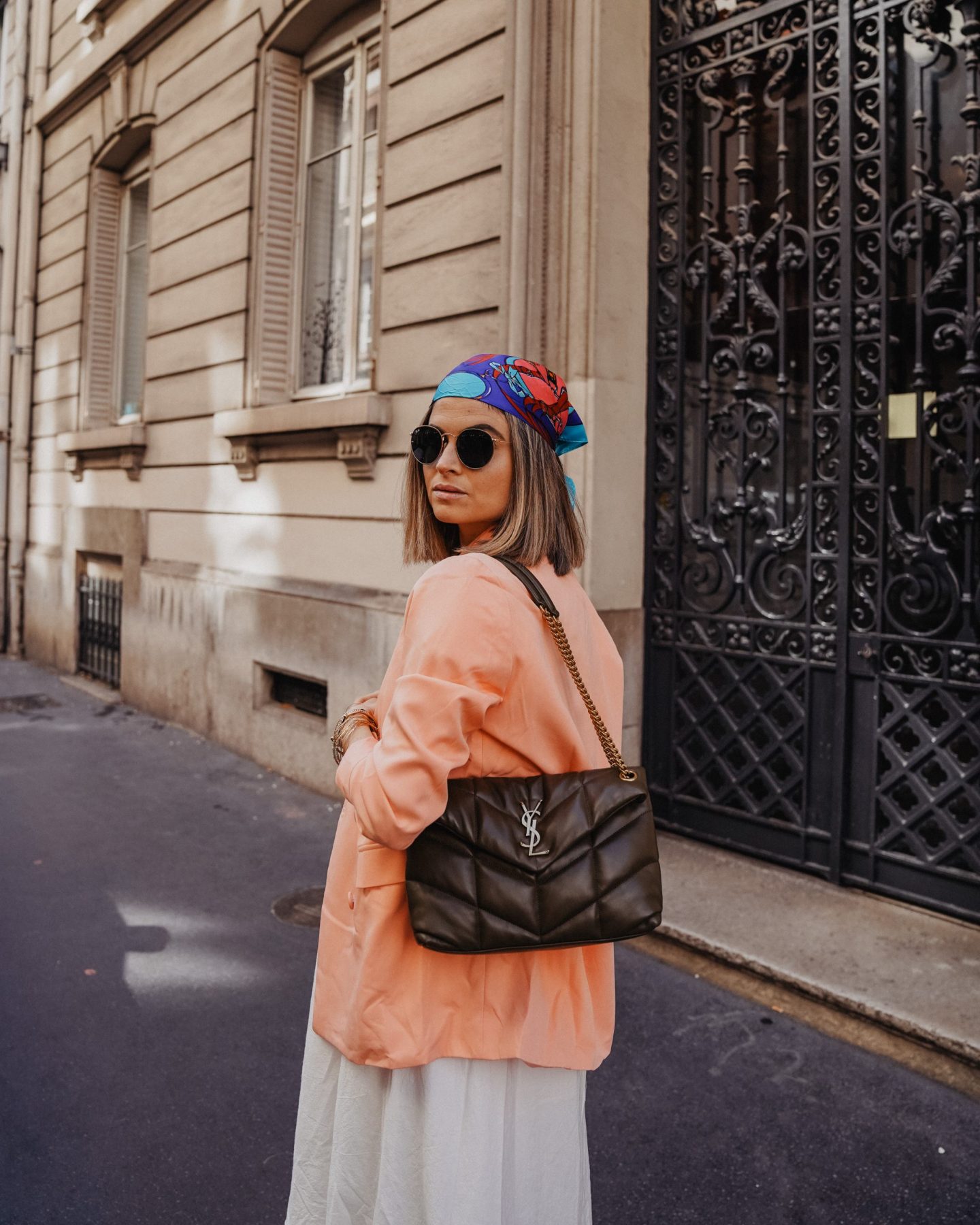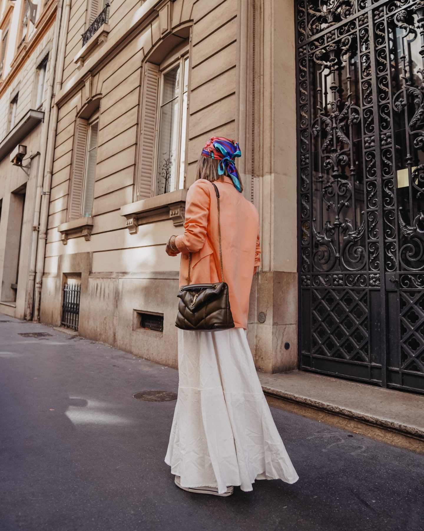 Pour la tenue, on est vraiment dans un style printanier avec une longue robe en lin (pour le coup bien opaque) porté avec un blazer rose – petit bémol, sur le site le blazer est fushia et à réception il est rose pêche – pour une touche de couleur et le foulard coloré pour faire un rappel avec le blazer.